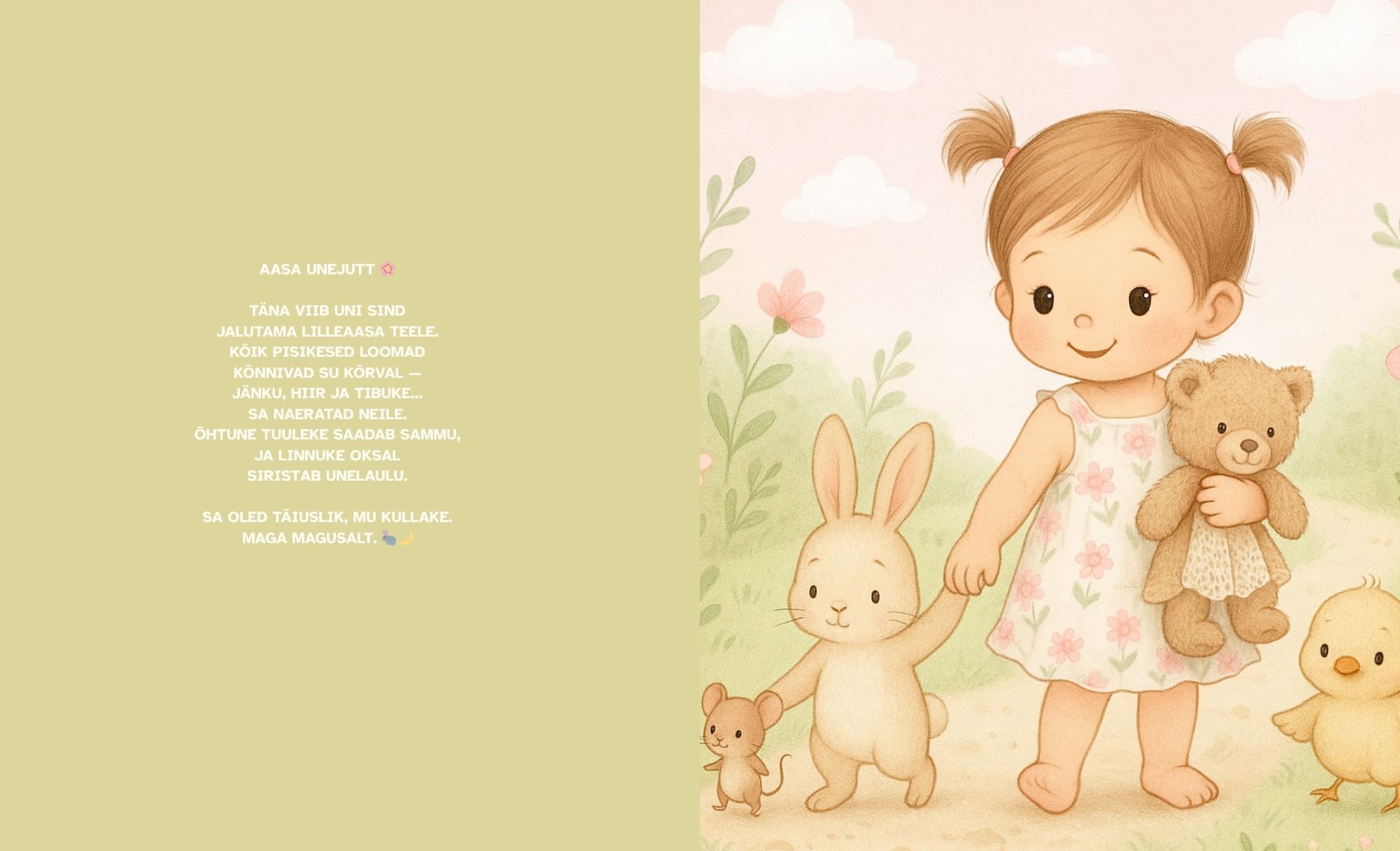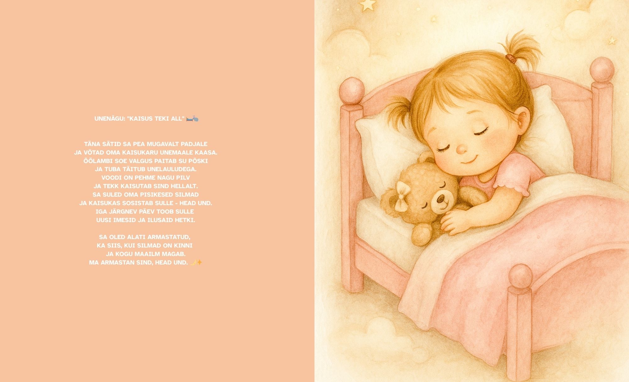 Raamatus on südantsoojendavad pisikesed unesoovid, mis toovad lapsele turvatunde ja aitavad kujundada igapäevase õhtuse rituaali. Neid võib beebile ette lugeda ja hiljem loeb laps juba ise – nii kasvab raamat koos lapsega. Armsad illustratsioonid ja hellad sõnad loovad unenäolise maailma, kus laps tunneb end alati armastatuna.