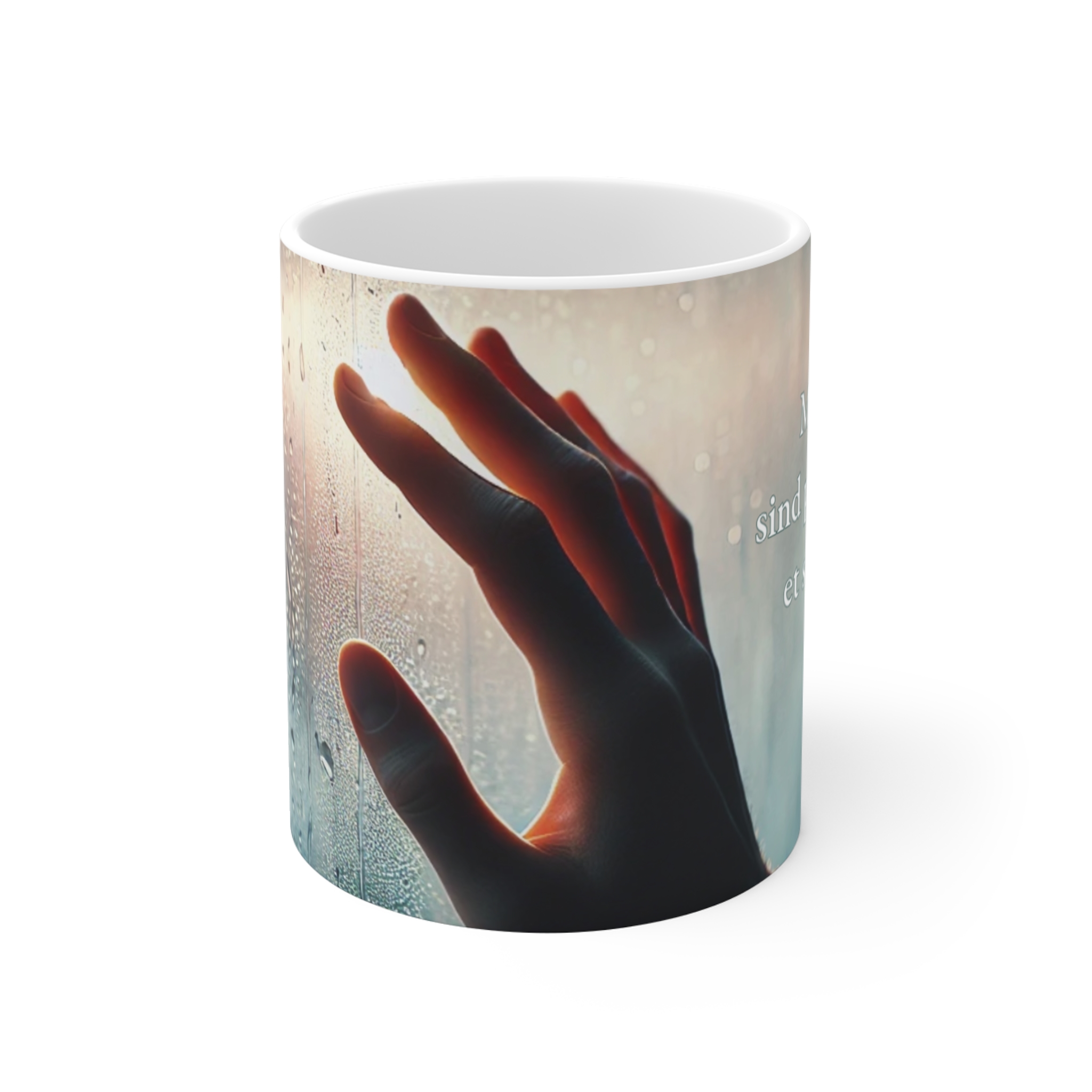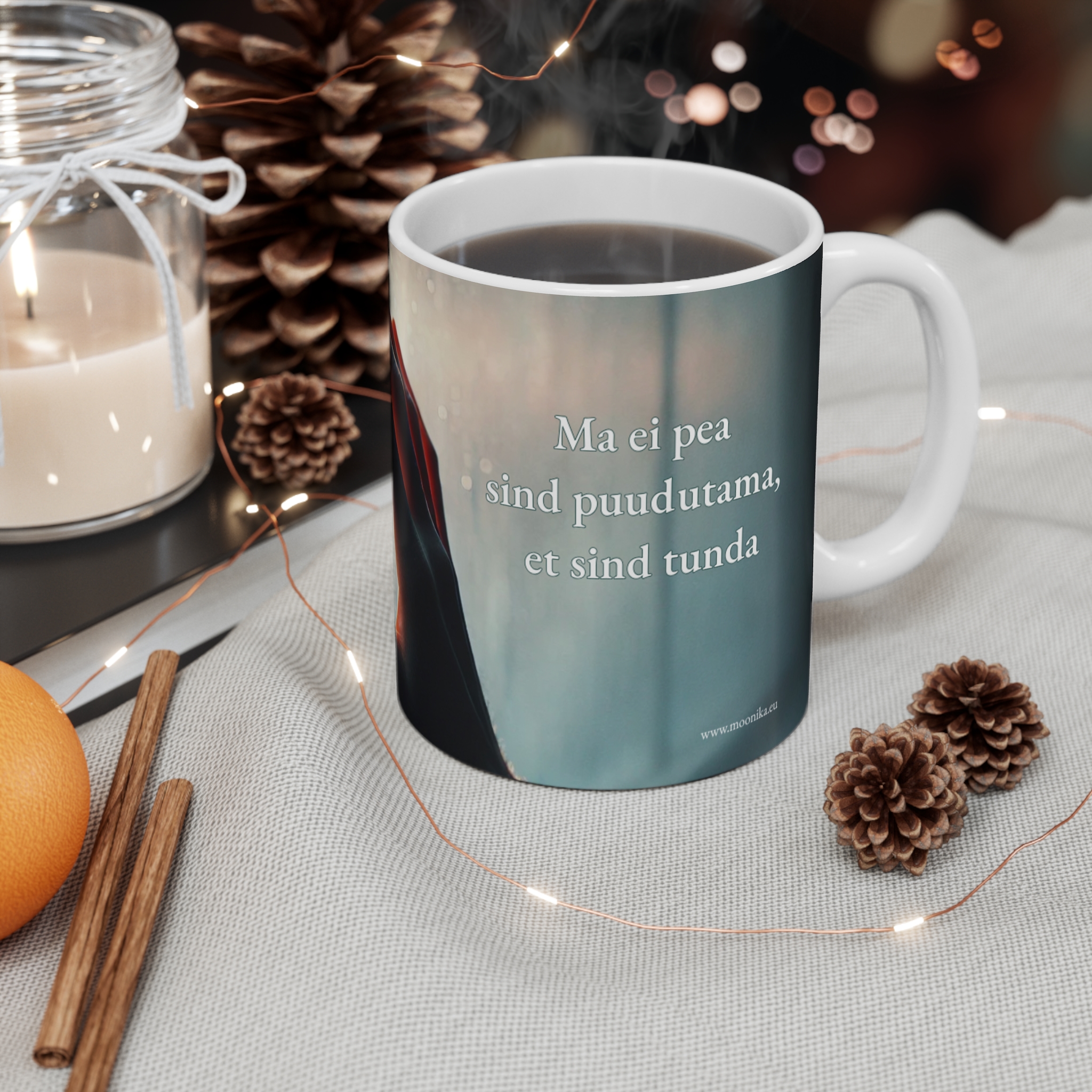 originaaldisainiga keraamiline kruus, millel on read: „Ma ei pea Sind puudutama, et Sind tunda.“