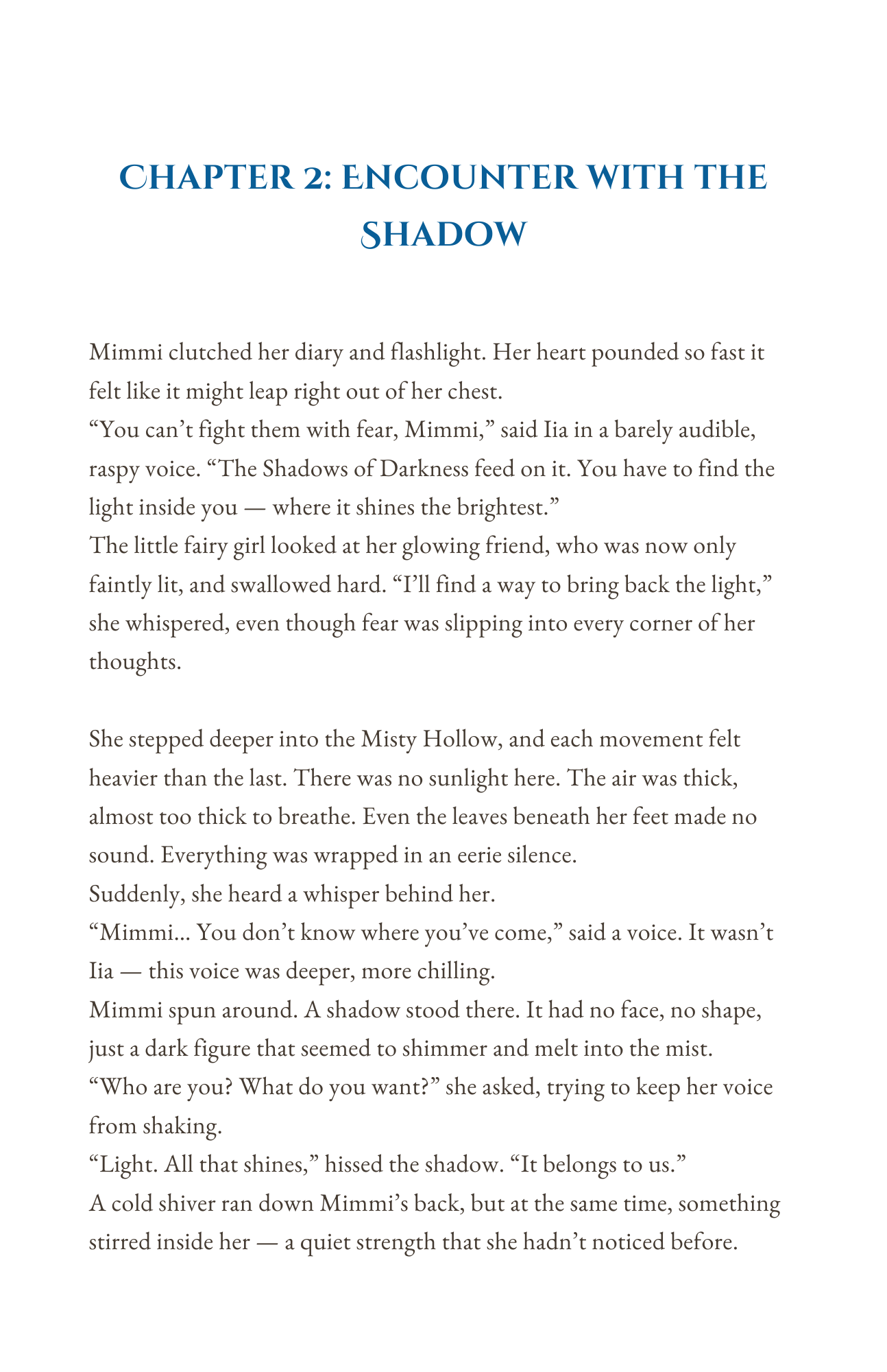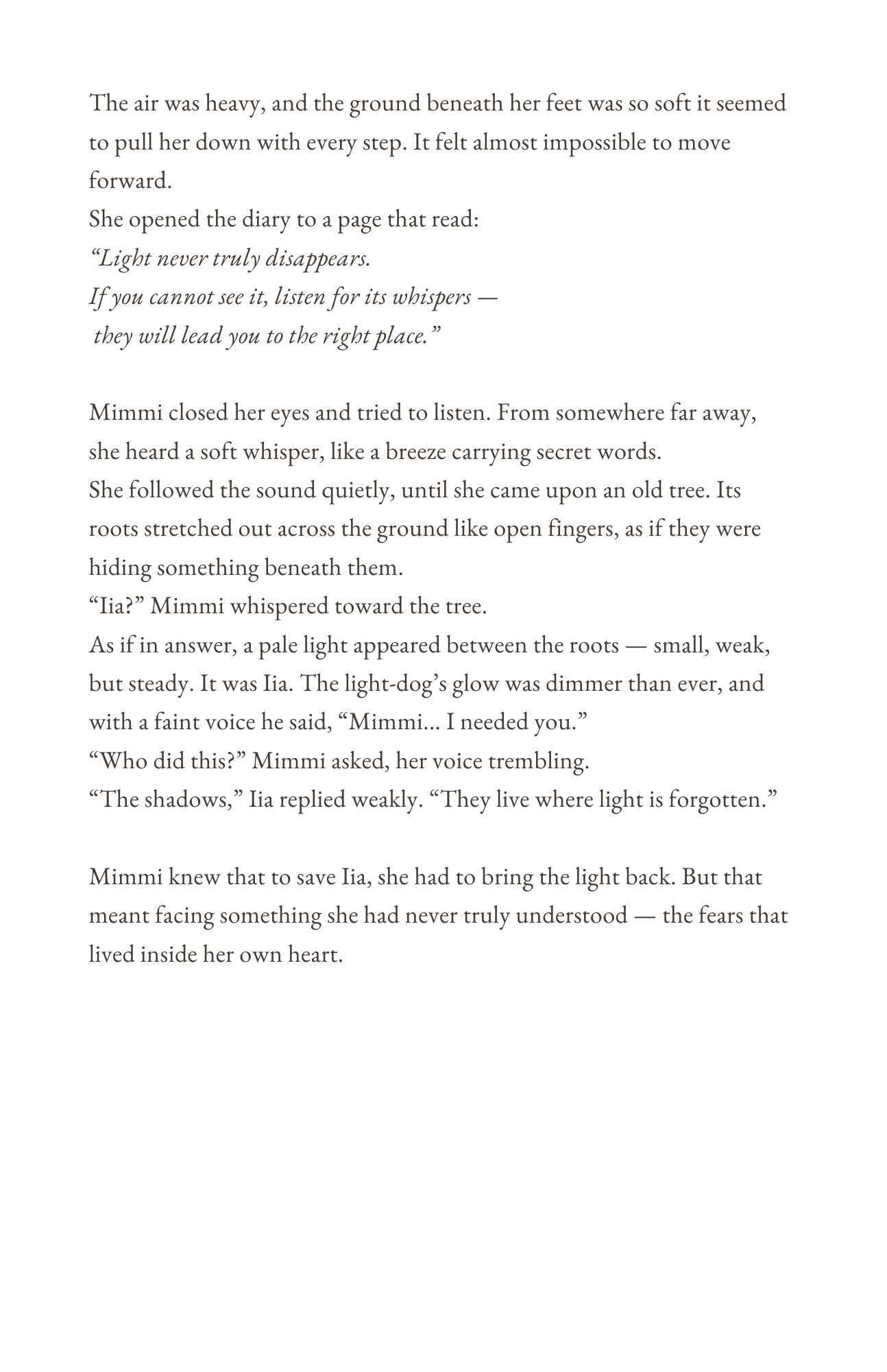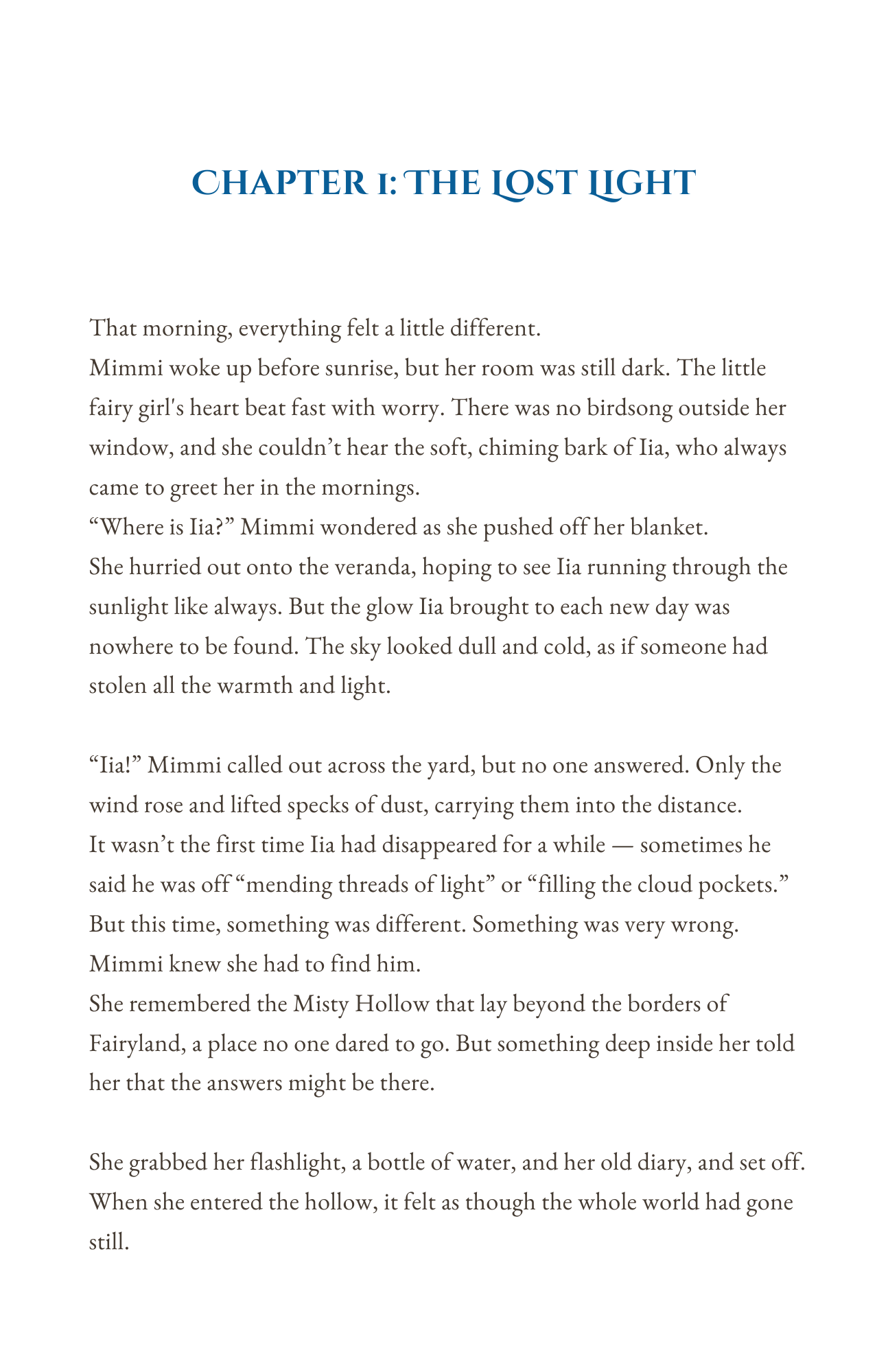 When the sun no longer rises and the birds fall silent, when the light has faded and the world grows still, a young fairy girl named Mimmi and her loyal dog Iia set out on a journey.